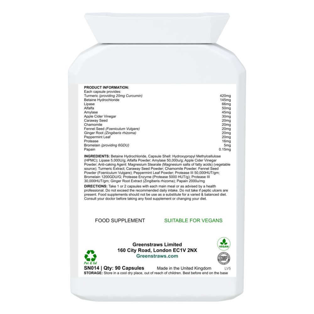 Plant-derived enzymes (betaine hydrochloride, lipase, amylase, protease, bromelain and papain), combined with a range of herbs (alfalfa, apple cider vinegar, caraway seed, chamomile, fennel seed, ginger root, peppermint leaf and turmeric (with curcumin))._x000D_